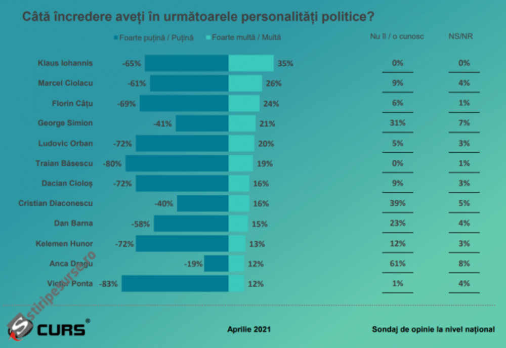 Partea proastă a sondajului este ca procentele cu cifra 2 în față arată de fapt o criză a încrederii cetățenilor în politicieni, în general. Doar șeful statului are 35 de procente, ceea ce arată că strategia i vizibilității a dat rezultate favorabile, dat fiind că în lu a februarie și Klaus Iohannis scăzuse sub 30%.