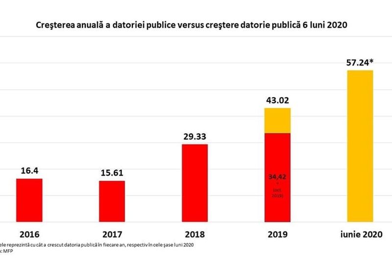 Observați în grafic o creştere cu peste 33% a datoriei publice pe primele 6 luni ale anului 2020, raportat la 2019.