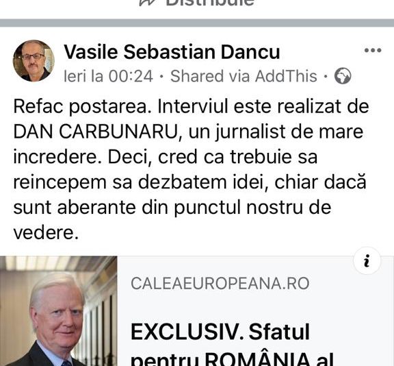 In timp ce toata lumea indeamna la calm si pace sociala in aceste momente de criza, sociologul Vasile Dancu vine cu un mesaj cel putin straniu care poate aduce prejudicii majore PSD. Acesta posteaza pe pagina personala de Facebook un interviu publicat de Calea europeana acum 7 ani cu Sir James Mirrlees, laureat al Premiului Nobel pentru economie, care indemna Romania sa iasa din UE. La ceva timp dupa ce a postat link-ul, Dancu a revenit cu o scurta completare, realizand probabil implicatiile grave pe care le poate avea o astfel de abordare in acest moment, si a precizat ca “trebuie sa dezbatem idei, chiar daca sunt aberante din punctual nostru de vedere.”