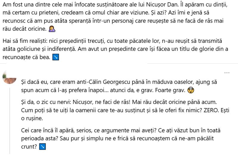 O admiratoare a avut o reacție similară: „Am fost una dintre cele mai înfocate susținătoare ale lui Nicușor Dan. Îl apăram cu dinții, mă certam cu prieteni, credeam că omul chiar are viziune. Și azi? Azi îmi e jenă să recunosc că am pus atâta speranță într-un personaj care reușește să ne facă de râs mai rău decât oricine.”