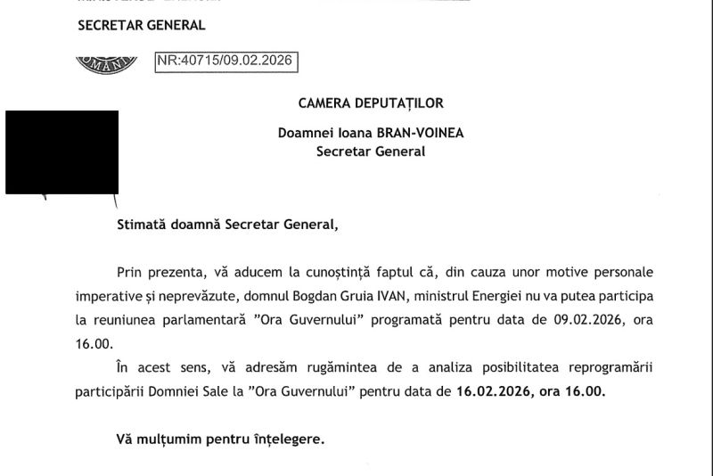 Ministrul Energiei, Bogdan Ivan, era așteptat luni, la ora 16:00, în fața plenului Camerei Deputaților, pentru a oferi explicații în cadrul dezbaterii „Ora Guvernului”. Acesta a trimis o depeșă că nu mai poate veni azi, și a mutat întâlnirea cu parlamentarii pentru data de 16 februarie 2026, ora 16.