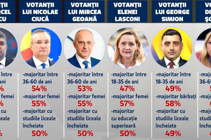 Realitatea Plus a prezentat, în exclusivitate, profilele votanților principalilor candidați la funcția de președinte al României, derivate din analiza socio-demografică a datelor făcută de profesorul Marius Pieleanu în urma sondajului Avangarde INSOMAR prezentat în exclusivitate la Realitatea Plus săptămâna trecută. Au fost luate în considerare principalele variabile - vârsta, gen și nivel de educație - pentru a sublinia cine și cum votează candidații la funcția de președinte.